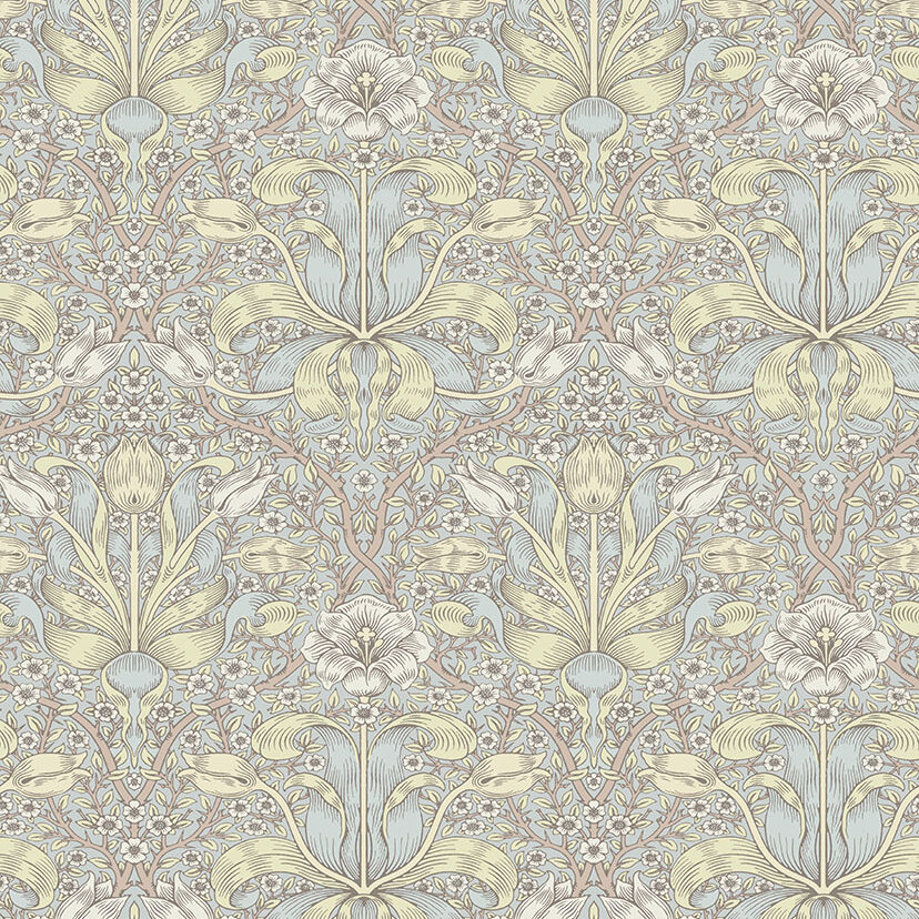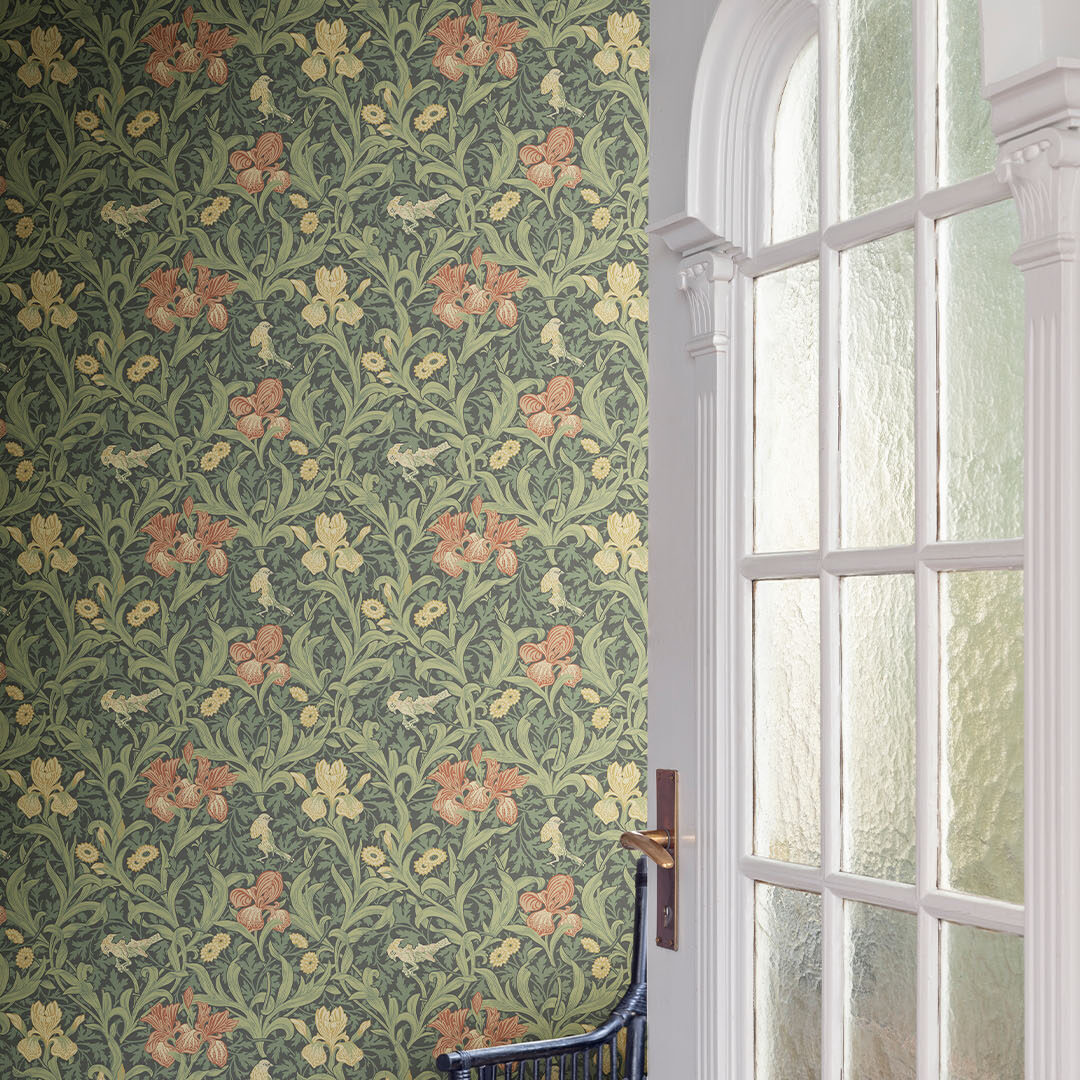 Kjærligheten William Morris hadde til naturen er godt dokumentert i hans verk. Iris er designet av John Henry Dearle, Morris sin protesjé. Ringblomster leker seg med små fugler i et hav av iris-blomster. Mønsteret tar med seg naturen og skogens sjarm inn i ditt hjem.