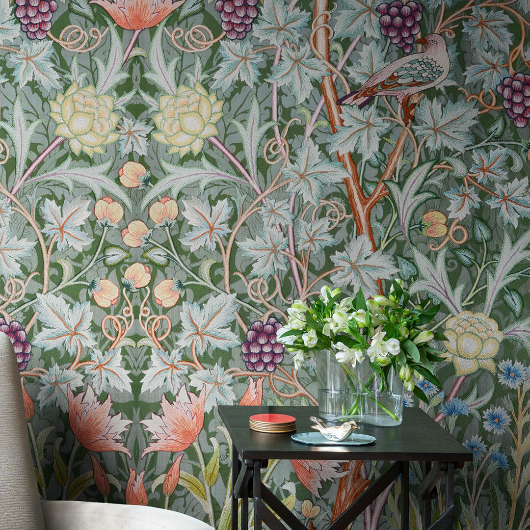 Vine Embroidery var opprinnelig et stort broderi fra 1896 som viser et dypt kratt i sterke, gode farger. Mønsteret er laget som et speilbilde som skaper en utvidende effekt i rommet. Designet kommer i 4 ulike farger.