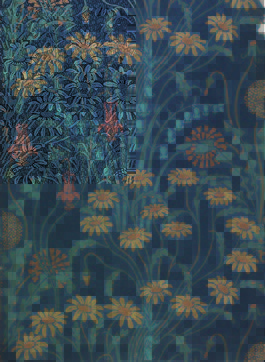 Flower Meadow 2412-178-01 (t.v.) og opprinnelig design fra 1904 (t.h)